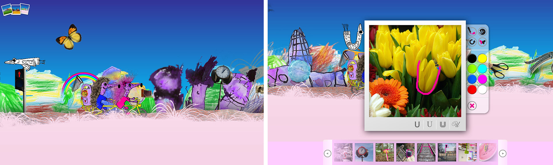 Multimedia Interactive Alphabet book The alphabet book makes use of the fact that newborn babies at first see shapes without naming them. Later, according to their development, children naturally switch from perception of the shape of objects and playing with things to the shape of letters. This is the principle our project is based on. The alphabet book is an interactive multimedia story. It follows the journey of two hedgehogs that go on a cycling trip in order to learn the letters of the alphabet. They are accompanied by their older friend, the bird „Letter“. The letters are all around, in objects and items, that come to their way. Both hedgehogs love taking pictures, so they photograph everything, these images become gradually an alphabet. A piece of music characterises each letter. The concept of letter´s shapes is used in the alphabet book as follows: The letter H is not related to how it sounds as in hedgehog or helicopter, but it is based on the letters’ shape. For example, train tracks with their sleepers form the letter H, which can be seen repeatedly. Like this: Letters can be rotated to the different positions around us; child can put them to correct position in the programme and that way learn the letters. The alphabet book is intended to support both hemispheres of the brain, and the cooperation between them, as well as concentration, spatial orientation, expanding knowledge, distinguishing shapes, memory, motor skills and hearing. This idea can be applied to any structured set of characters.